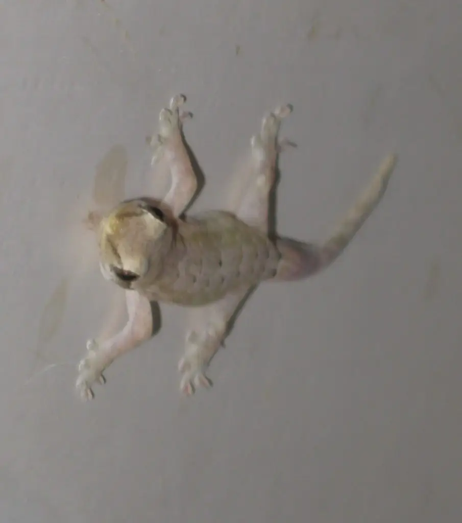 Now one of the really fun things about geckos is that they don’t inhabit the same universe as the rest of us. Or they do but the gecko equivalents of Isaac Newton and Albert Einstein said “You want to do WHAT?” Thought about it a second and said “Well, OK. Sure.” While your normal run-jump-scurry-swim-fly type pet bases its movements on the Theory of Gravity. Geckos seem to base theirs on the Theory of Paint. I’ve seen ours relaxing quietly upside down on an overhead beam and its tail is resting on that same inverted surface. Cool!